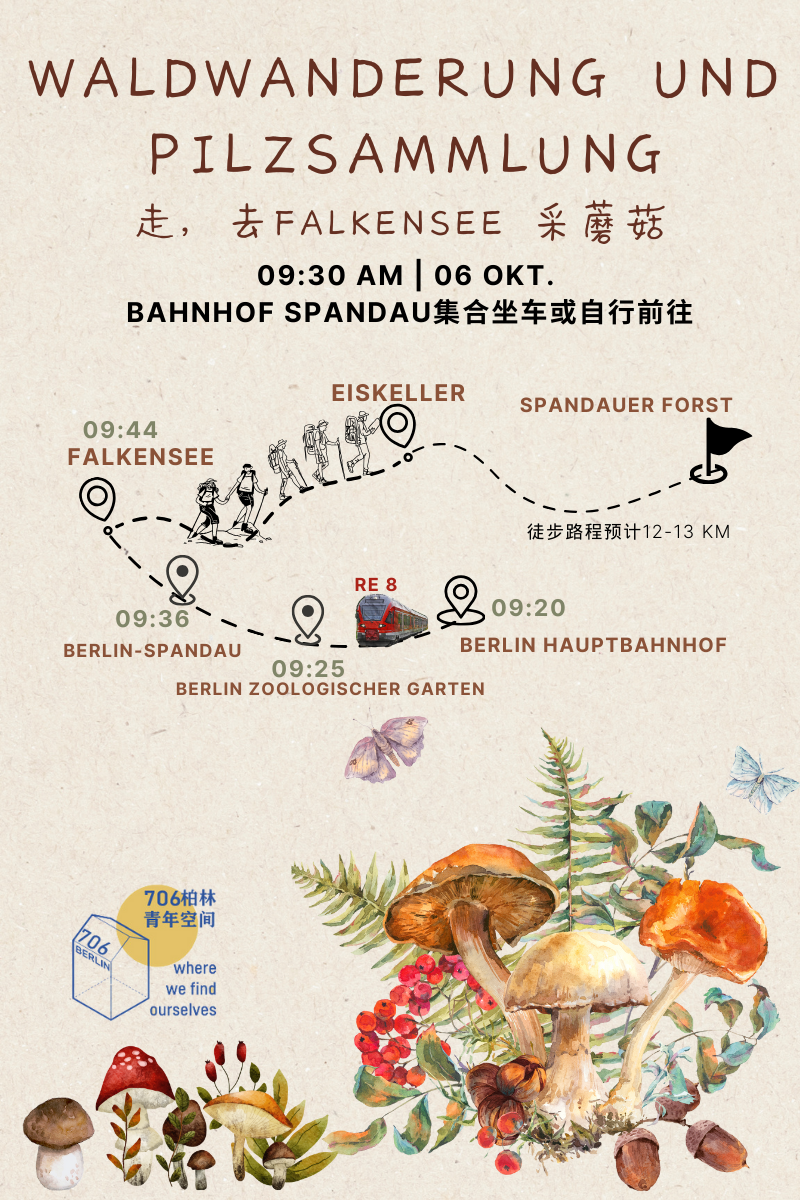 近期,社群朋友们对蘑菇的热情高涨,在这样的时节,也是我们久违的户外吸氧活动。 秋天悄然而至,大自然正以丰饶和色彩欢迎我们走进怀抱!趁着这个美好的季节,706柏林的"自然观鸟小组"组织一场Falkensee徒步与采蘑菇之旅,或许路上还能看看鸟类。我们一起走进金色的树林,呼吸清新的空气,接收大自然带来的平静。 我们将穿越安静的小径、森林和田野,享受宁静与自然的和谐。同时,秋天是蘑菇生长的季节,我们将沿途寻找各种野生蘑菇,体验采摘的乐趣。你或许会发现隐藏在落叶中的美味松露、蘑菇或其他意外惊喜! 行程安排: 集合时间:10月6日(周日)上午9:30 集合地点:Spandauer Bahnhof(可以在此集合一起乘坐RE 8,也可就近站点自行上车) 路线规划:从柏林乘坐RE 8前往Falkensee,徒步经过Eiskeller,到达Spandauer森林,最终一起乘坐火车回程,全程约12-13公里。 注意事项: 1、因为地上和草里会有水,建议穿结实点的鞋,(是否要带雨伞看天气预报) 2、这个季节就不用怕蜱虫和蚊子 3、因为在野外会待大半天天,所以大家自备好足够吃的喝的 4、愿意带望远镜的,欢迎欢迎,偶尔的肯定有些鸟过来 5、还可以带:小篮子装所采的蘑菇,小防水坐垫,小刀 欢迎向我们的邮箱info@706berlin.com报名。