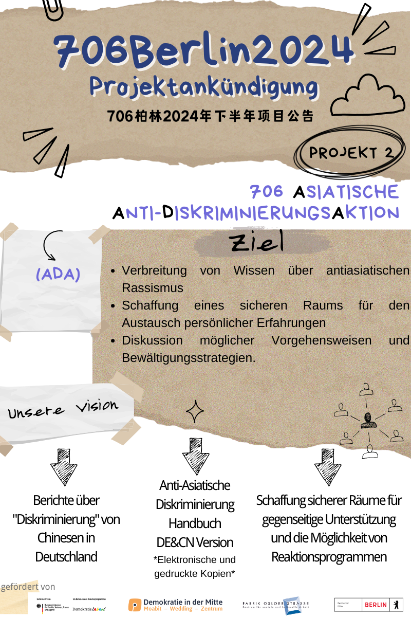 活动内容: 欢迎加入我们的艺术实践之旅,这场工作坊将带您穿越种族歧视、性别歧视与父权制的交织迷雾。我们邀请您一起用创意与反思的双手,揭开这些社会现象的深层面纱,探索其交织在现代社会中的复杂影响。 工作坊的序幕将在自我介绍和目标设定中展开,我们将共同建立一个安全且充满启发的讨论空间。我们将探讨“种族歧视”和“性别歧视”的定义,深刻解析它们如何在父权制的背景下相互交织,共同塑造我们的社会结构。在实践环节,您将通过角色扮演和情景模拟,身临其境地体验并应对歧视情境。这一部分不仅是对策略的练习,更是对如何在父权制体系下识别和挑战歧视的深度探讨。艺术创作环节将为您提供一个表达内心的舞台。通过拼贴画和色彩的艺术语言,您将创造出展现个人情感和集体智慧的艺术作品。这些作品将成为对抗歧视和不平等的象征,并展现我们对变革的共同愿景。工作坊的尾声,我们将汇聚感悟分享反思,并收集反馈,为未来的行动铺路。这不仅是一场知识的探讨,更是一次艺术的表达,一次共同追求平等与尊重的创意之旅。 IT'S TIME TO FIGHT BACK! 10:00-10:30 破冰环节 10:30-11:30 理论基础提供并解释关于种族歧视,性别歧视以及两者交叉歧视的定义,并深入探讨这两个概念的关键要点和现状。 11:30-12:30 讨论与提问参与者写下对于种族歧视和性别歧视的提问或最近的发现和反思,并进行讨论。 12:30-13:30 休息提供茶点,非正式交流时间,放松 13:30-15:30 实践活动将参与者分成小组,互相交流彼此的亲身经历或者是听闻的经历,设计出一些实际的情境,如在职场或者学校里的歧视事件,参与者分组进行角色扮演。 15:30-17:00 创意拼贴画(提供彩色纸、透明纸、剪刀和胶水等工具)每人需有一部手机,亮着的手机屏幕将作为绘画工具的-部分。现场还将提供一些在网络上收集的陌生网友们关于种族歧视和性别歧视的被打印出来的帖子。 17:00 总结与回顾 简短回顾工作坊的内容,感谢参与者的积极参与和贡献。 该活动在“demokratie in der mitte”基金项目框架下支持 活动回顾(照片无先后顺序,随机上传): (image: wechatimg848.jpg) (image: wechatimg831.jpg) (image: wechatimg832.jpg) (image: wechatimg834.jpg) (image: wechatimg837.jpg) (image: wechatimg839.jpg) (image: wechatimg842.jpg) (image: wechatimg844.jpg) (image: wechatimg845.jpg) (image: wechatimg846.jpg) 感谢大家的参与,我们下次再见~