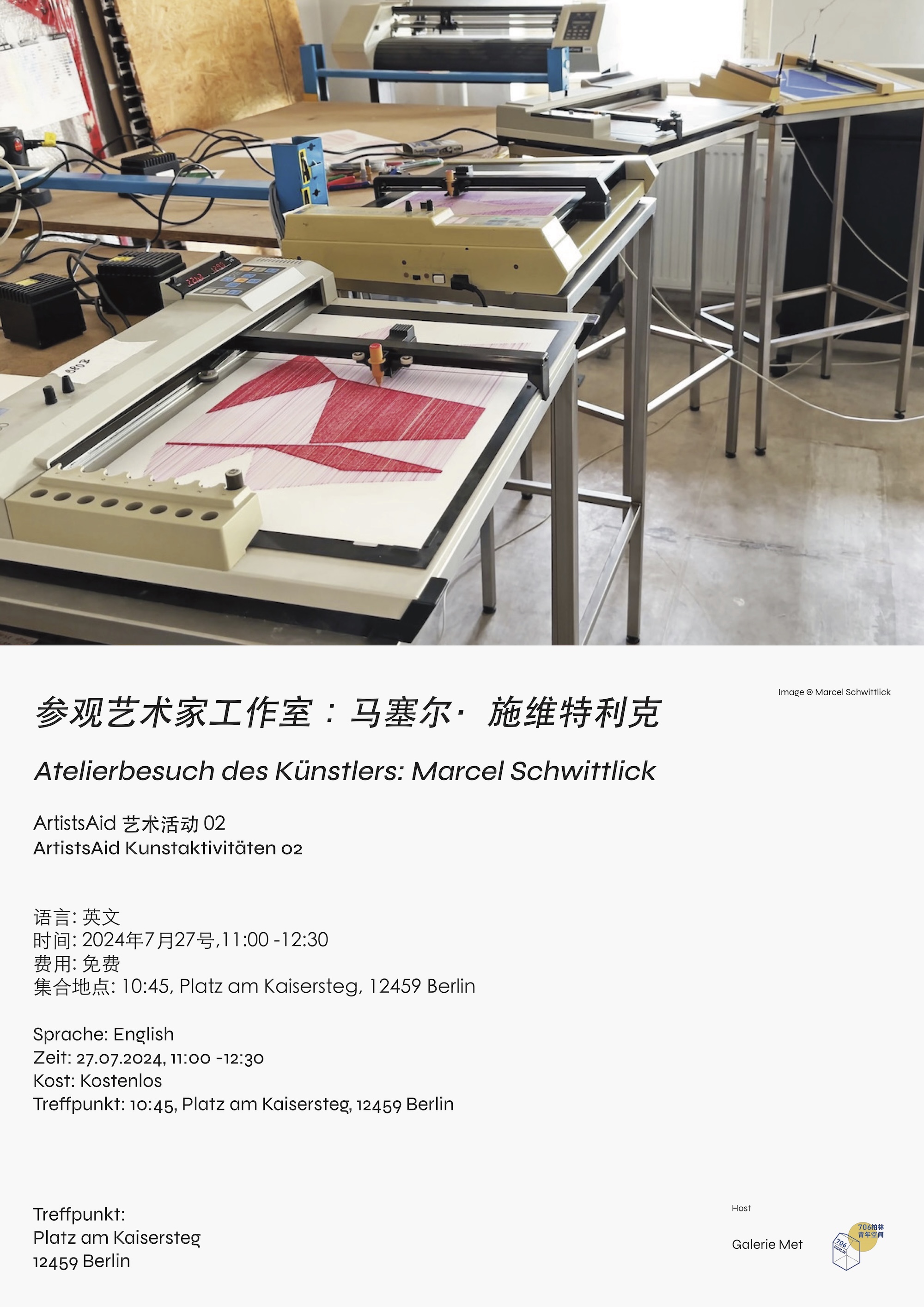 “ArtistsAid”月更计划的第二个月,将于7月27号周六一起:参观柏林艺术家马塞尔·施维特利克(Marcel Schwittlick)的工作室。这次活动我们可以看到马塞尔·施维特利克收藏的1970到1990年代的几十台复古机械笔,并了解他通过自己写的程序来控制机械笔进行绘画的作品制作过程。 马塞尔·施维特利克(Marcel Schwittlick)是一位生活在柏林的艺术家,他结合了数字艺术和物理艺术,利用绘图机和算法系统进行创作。他的作品涵盖生成艺术和绘图艺术,将数字光标线转化为实体艺术品。马塞尔·施维特利克从生成美学和计算机算法中汲取灵感,创造出既富有趣味又有意义的几何图案。凭借在计算机和艺术领域的经验,他用老式复古绘图仪和自制算法进行创作,探索艺术和机器之间的共生关系。他的作品不仅可视化了人为控制与电子随机性,还包括了听觉维度。 这次参观我们可以看到艺术家之前创作的一系列作品并了解其背后故事,包括《79号构图 》(Composition no. 73) 、《82号构图 》(Composition no. 82) 、《83号构图 》(Composition no. 83) 、《92号构图 》(Composition no. 92) 、《94号构图 》(Composition no. 94)和《96号构图 》(Composition no. 96)等。 活动中我们可以近距离接触艺术家使用的复古机械仪:如HP 7470A、HP 7550A/B、HP DraftMaster SX & RX、Mutoh XP-500、Roland DXY 1200、990、980 和 Graphtec MP2000。同时也可以学习到艺术家如何使用机械控制各种材料: 如酒精墨水、80年代的水性毡尖笔、现代的水性绘图笔、固体颜料墨水、铅笔(石墨)、圆珠笔。马塞尔·施维特利克(Marcel Schwittlick)于2024年5月29日至6月9日在柏林Galerie Met举办了其个展《94号构图 (垂线测试)》(Composition no. 94 (Vertical Line Test))。 展览中艺术家通过80年代的绘图机器和自己的编程算法将数字艺术和物理绘图艺术融合,将数字化的光标线条转化成有形的几何艺术品。尽管生成艺术看似随机,实际上却基于精确的数学原理和算法。艺术家将近十年来收集的光标运动数据作为主要基础,然后通过数学函数把它们转换成生成艺术。个展《94号构图 (垂线测试)》可以在Galerie Met网站观看。 更多信息: 艺术家网站:https://schwittlick.net 艺术家个展《94号构图 (垂线测试)》:https://galeriemet.com/past-exhibitions/marcel-schwittlick-composition-no-94-vertical-line-test 艺术家作品《94号构图 (垂线测试)》幕后故事:https://galeriemet.com/journal/story-turn-the-plotters-on 活动时间 2024年7月27日 10:45 开始集合 11:00-12:30 开始参观 集合地点 Platz am Kaisersteg, 12459 Berlin 活动费用 免费 招募人数 15人 (link: https://docs.google.com/forms/d/e/1FAIpQLSc5Ym5mMU3_J9XkLdI_3Oe32dyIaPaEgVWhPlSJaSQAf_Ewcg/viewform?usp=sf_link text: 点击此处报名)