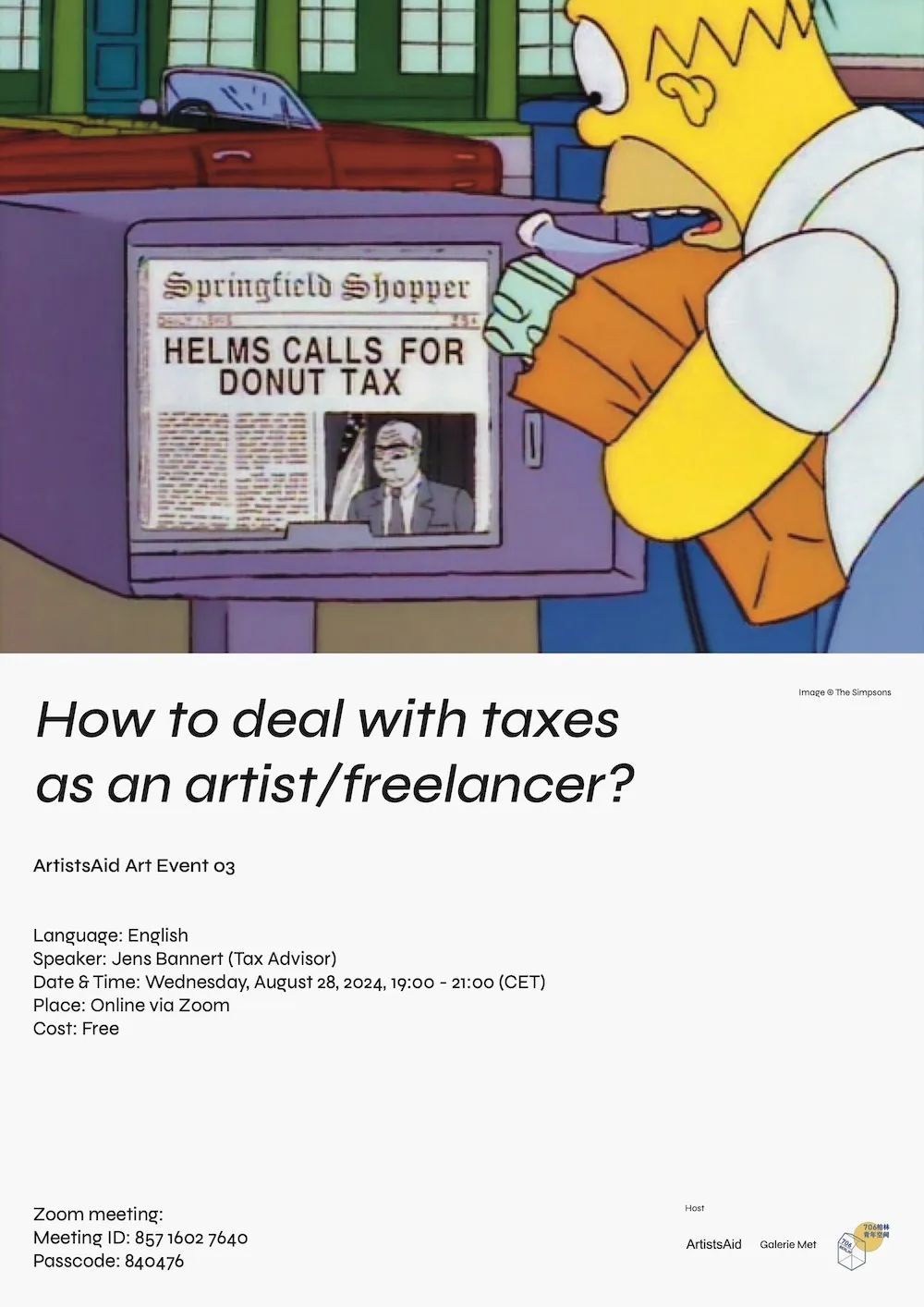 艺术家与自由职业者税务在线讲座 | 706柏林&ArtistsAid8月28日活动预告 你是艺术家或自由职业者吗? 在报税季节被复杂的税务问题困扰? 不确定哪些费用可以抵税? 或者担心税务问题会影响签证续期? 前面两周时间,我们线上征集了不少税务相关方面的问题,而这一场报税线上讲座,税务师Jens Bannert为创意工作者揭开税务迷雾,帮助你最大限度地减少税负,避免常见错误。你也可以扫码加入微信群聊,找到组织,及时得到信息更新和互相抱团~ 🗓 日期与时间:2024年8月28日(星期三)19:00 - 21:00 (CET) 📍 地点:线上Zoom会议 🎙 讲师:Jens Bannert(税务顾问) 🌍 语言:英语 🎟 费用:免费 活动安排: 19:00 - 19:15: 介绍ArtistsAid和Jens Bannert 19:15 - 19:45: 艺术家与自由职业者如何处理税务 19:45 - 20:15: 税务扣除技巧 20:15 - 21:00: 问答环节 🔗 Zoom会议:会议ID: 857 1602 7640 密码: 840476 活动由@ArtistsAid @galerie_met和@706berlin联合主办。赶快在日程表里码下,让我们一起减轻报税季的压力😉 (image: 20240817-ch.png)