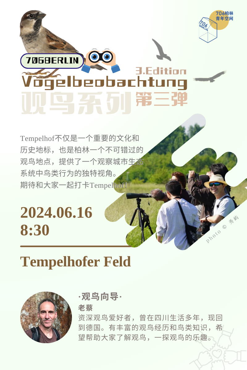 6月16号周日上午8:30,我们将在Tempelhof进行第三次观鸟。 柏林的Tempelhof(Tempelhofer Feld)是一个独特且历史悠久的公共空间。它曾经是一个机场,现在转变为一个广阔的公园和休闲区,这里也成为了观鸟的一个热门地点。以下原因使Tempelhof成为一个不错的观鸟点: 1. 广阔的开放空间:Tempelhof的设计保留了它作为前机场的开阔空间,提供了极佳的视野,便于观察飞行中的鸟类。这种开阔地带吸引了许多在城市中较少见的鸟种。 2. 多样的生态环境:尽管Tempelhof是一个主要由草地组成的开放区域,但它也包括了一些灌木丛和小树林,形成了有草地、灌木、树林杂生的自然生境,为鸟类提供了栖息地和食物来源。此外,场地上还保留有一些人造结构,如废弃的跑道和建筑,为某些特定种类的鸟类如燕鸥等提供了繁殖地。 3. 城市中的绿洲:作为柏林中心区域的一部分,Tempelhof提供了一片相对安静的避难所,吸引了许多城市中不常见的鸟类。这使得它成为城市观鸟的理想地点。 4. 观鸟社区的活动:Tempelhof是许多当地观鸟和自然爱好者社区活动的中心。定期的观鸟活动和教育项目帮助提高公众对野生动物保护的意识,并鼓励更多人参与观鸟。 5. 便捷的地理位置:Tempelhof的中心位置使得它非常便于访问。它位于城市中心,通过公共交通就可以轻松到达,这吸引了大量本地居民和游客。 因此,Tempelhof不仅是一个重要的文化和历史地标,也是柏林一个不可错过的观鸟地点,提供了一个观察城市生态系统中鸟类行为的独特视角。期待和大家一起打卡Tempelhof! 详细信息请查看:https://mp.weixin.qq.com/s/coMcc12rAtvgVS3zUgNKKw