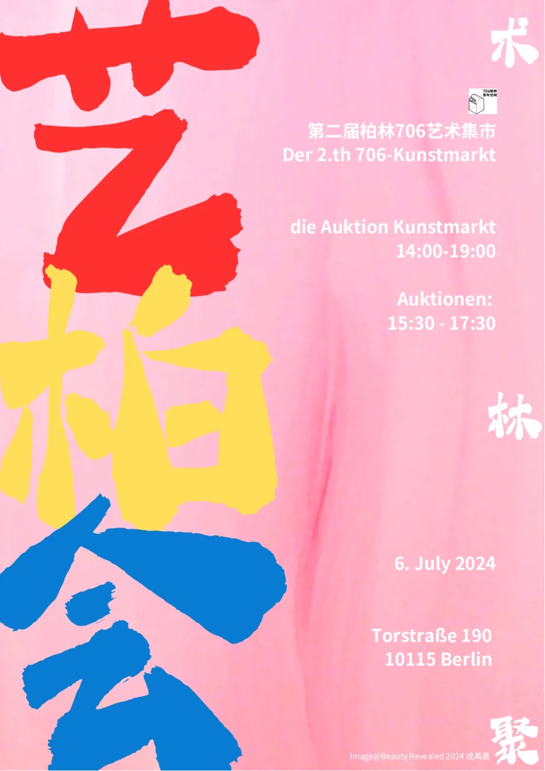经过2个多月的活动策划,协调组织和整整1个月的艺术家招募、作品征集,我们的第二届艺术集市&艺术拍卖将会在7月6日周六(艺术集市14-19点,拍卖15:30-17:30)跟所有人见面!地点在MITTE活动中心。(TORSTRASSE190, 10115 BERLIN) 706艺术集市,是一片汇聚原创艺术的沃土。每一件展品都是艺术家们的独立创作,不仅展示了技艺的精湛,也传递了创作者的个人情感和思考。 今年是第二届,我们也有了一个具体的名字——“艺术柏会”(命名特别感谢@卢青),它清晰而简洁地传达了艺术(艺)、柏林(柏)、聚会(会)三方面的核心信息要素,让艺术爱好者们对整个活动的多样性和综合性有了更直观的理解: 一个汇聚艺术、文化、学习和交流的当地华人艺术平台。 详细信息以及报名请查看网站:https://mp.weixin.qq.com/s/AsUCx8q4UQpaAINQt4wNkg
