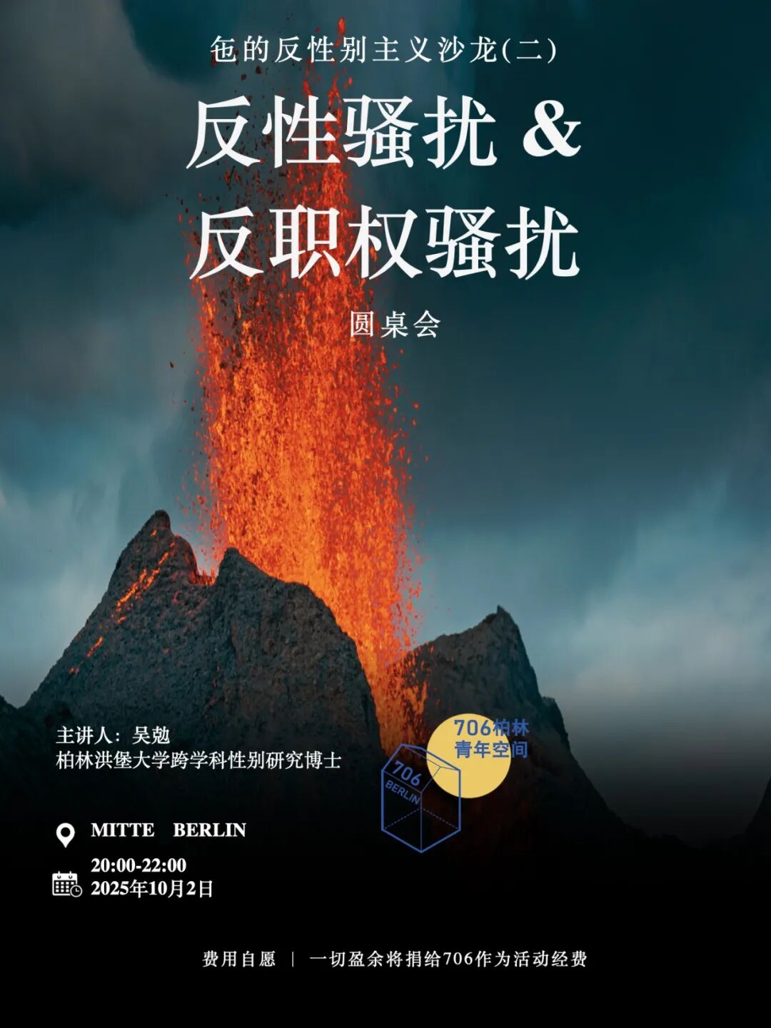 亲爱的朋友们, 社会学研究,特别是性别研究,从来都不仅仅停留在理论和书本上,它历来强调实践与行动——关注人在社会中的真实处境,回应生活中的不平等与困境。正是在这种行动导向下,许多推动社会进步的思考与实践不断发生。今天,我们也希望延续这种传统,用一次开放的交流,把抽象的概念落到生活的点滴之中。我们希望通过这次活动,用轻松但有力的方式,去探讨一个与每个人息息相关的话题——性骚扰与职权骚扰。 创造治愈圆圈(Healing Circles)的祖鲁人相信:“在我被他人看见之前,我并不是真正存在的。我的心理痛苦,如果没有他人聆听,就得不到见证。” 这套方法用社群的力量去治愈个体遭遇歧视与冒犯的创伤。我们也可以创造自己的反性骚扰与反职权骚扰文化,创造可以接纳表达不适与愤怒的空间,无论性别。这项行动本身就是在解构性别主义(Genderism)。 ### **主要内容** **1. 什么是性骚扰?** 在越注重性别公正的社会文化环境中,对性骚扰的认定,往往越看重被冒犯者的感知,而不是行为人的意图。这一点在不同文化环境下的司法实践中也能看到。 💬你一言,我一语,聊聊使你感到不舒服的言行举止,即使再微小,再不被主流所认可,也没有关系。我愿意倾听你的感受 : ) ✨小思考:在你身处的社交与文化环境里,“目光”是否可能构成冒犯? **2. 性骚扰与职权骚扰为什么常常“ 捆绑出现”?** 🔹2.1 基于权力的不对等 日常生活中,性别权力体系往往和其它权力体系共同作用。在当今社会情境中,又往往和职权交联互通。 另外,权力的不对等使被冒犯者求诉无门,而行为人往往不用付出代价,造成恶性循环。 🔹2.2 商业主义与性别主义的“共谋” 当女性身体被当作消费的对象时,压迫常常伪装成“自愿”。 女性常常被期待以迎合异性恋男性的形象出现,如以“性感”、“裸露”的方式呈现。 她们被凝视、被评论,承受额外的声誉与形象风险,提供额外的无偿劳动。 幕后策划者和整个父权文化却很少受到审视与追问。 而当女性自行支配自己的身体,特别是因此获益时,社会反而常常给予道德指摘、贬损抹黑,甚至伴随着作为“警告”与“惩罚”的骚扰,这又是为什么呢? **3. 被性骚扰者的困境 & 骚扰者的常见开脱** 一起探讨: ❓为什么受害者往往陷入两难? ❓骚扰者常用哪些理由为自己开脱? 其根源是不为我们所熟知,却在社会生活的方方面面埋下隐患的强奸文化(Rape Culture)。 **4. 被性骚扰的男性的额外困境** 在个体层面,男性往往也是性别主义的受害者。被性骚扰的男性的困境值得被认真看见! **5. 🥊和平发泄环节(认真又好笑)** 最后,我们来点轻松的!在一个安全封闭的空间里,由发起人带领,大家可以畅所欲言,分享生活与工作中那些让人心累、有苦难言甚至想掀桌子的经历。 说完还不够?没关系,我们准备了小游戏,帮助大家发泄心中那如火山喷发般的熊熊怒火,以促进身体健康、社会安宁🙂 **温馨提醒:** 想参加游戏的朋友们,记得带一个用完的卫生纸纸筒。没错,就是它!它将是我们本次“和平发泄”的秘密武器 🤫。 📣欢迎大家报名参与! 让我们在讨论和笑声中,既勇敢直面问题,也收获轻松与力量。 时间: 10月2日(次日为节假日) 晚上 20:00 - 22:00 地点: 柏林 Mitte (报名成功后邮件通知) 费用:自愿。 如有盈余,除去饮料成本,全部捐赠给706柏林作为反性别歧视活动经费 招募人数:15人 **发起人** 吴勊 性别代词 汉语: 㐌, 英语: they, 德语: * 出生于北京;柏林洪堡⼤学(Humboldt-Universität zu Berlin)跨学科性别研究博士,博士论文Genderismus in chinesischen Sprachhandlungen(汉语中的性别主义)获得最高学术荣誉 summa cum laude,马尔堡大学(Philipps Universität Marburg)欧洲人类学与文化研究硕士、社会学与国民经济学学士。