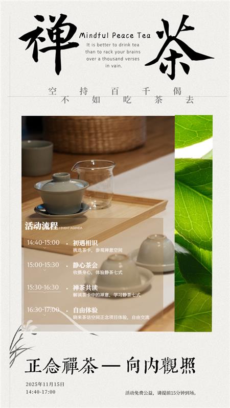 ## 【活动内容】 在快节奏的生活中,您是否渴望片刻的宁静与觉察? 禅茶,是一次回归简单、专注当下的练习,就像茶叶在水中舒展,我们也学习放松与敞开,感受万物的流动与变化。 本次禅茶体验,将带领你通过正念禅修,专注于泡好一杯茶,训练专注力与觉知力。 你会发现,当我们用觉知的心泡茶、品茶,茶与禅便合而为一。 在两个小时的过程中,您将学会如何在日常生活中找到平静,感受自己与当下的链接。 无论您是禅修初学者,还是想要放慢脚步、重新认识自己的现代人,都欢迎加入这场身心灵的茶席。 让我们一同在茶香中,遇见更加清晰的自己。 ## 【活动安排】 ### 活动时间:2025年11月15日, 周六, 15:00-17:00 ### 活动地点:柏林Pankow区,具体地址报名后邮件通知 ### 活动流程: 14:40 - 15:00 活动开始,挑选茶卡,参观禅意空间 15:00 - 15:30 静茶七式,静心共饮三杯茶 15:30 - 16:30 茶卡讨论,静茶实操 16:30 - 17:00 小院各项正念项目自由体验 ## 关于柏林晓来茶话空间 我们期待在每个月精心举办一次“一期一会”禅意生活公益活动,以正念、观心、宁静和安住当下为核心媒介,通过禅茶、正念咖啡、插花、八段锦、正念球、静心蔬食、中医按导等多元体验,打造专属于你的心灵自我探索时光,在温暖安适的氛围中,放下生活的忙碌与压力,细腻觉察内心的声音。每一次相聚,都是独一无二的体验,携手感受正念的力量,在现代快节奏中发现自我,收获平衡与内心的宁静。 活动费用:公益活動-免費 活动人数:max12人 报名链接及报名方式:(link: https://docs.google.com/forms/d/e/1FAIpQLSdS6225GSxeKQCTacT9Wd6w19c_4_6WU0nj-OsG_9LjxcsdDQ/viewform text:** 链接**) 通过以上链接报名,报名成功后会收到确认邮件。 如果错过了这次活动,也没关系,欢迎联系发起人关注后续的活动(xiaolai.mindfulness@gmail.com) **注意事项**: 活动场地需要大家脱鞋入场, 请大家穿舒适的袜子。 ## 【发起人】 Tori 我是柏林的一名留子,常年在Berlin SCC Sportverein、706berlin、临终关怀医院以及上面这个禅意活动小院做志愿者。 偶尔我会问自己:我是谁?我这辈子来到这个世上的意义到底是什么? 有时候,也会因为自己不像别人那样上进,或有清晰的步步规划而迷茫和沮丧。 我其实是个非常急性子的娃,能跑着绝不溜达着。上个厕所虽不至于奔得连滚带爬,但也总是来去急匆匆。可在一次次的禅茶练习中,我发现自己开始慢慢享受安静,学会了等待。 水沸时就听水沸腾的声音,水静时就听水安静的声音,就和自己呆在这一刻,没有什么目标非要达成。 禅茶不仅驯化我稳下来,也将我浮躁飘摇的心渐渐缓了下来。 所以,这次就诚挚地邀请你一起吧——将心来,与汝安。 ________________________________________