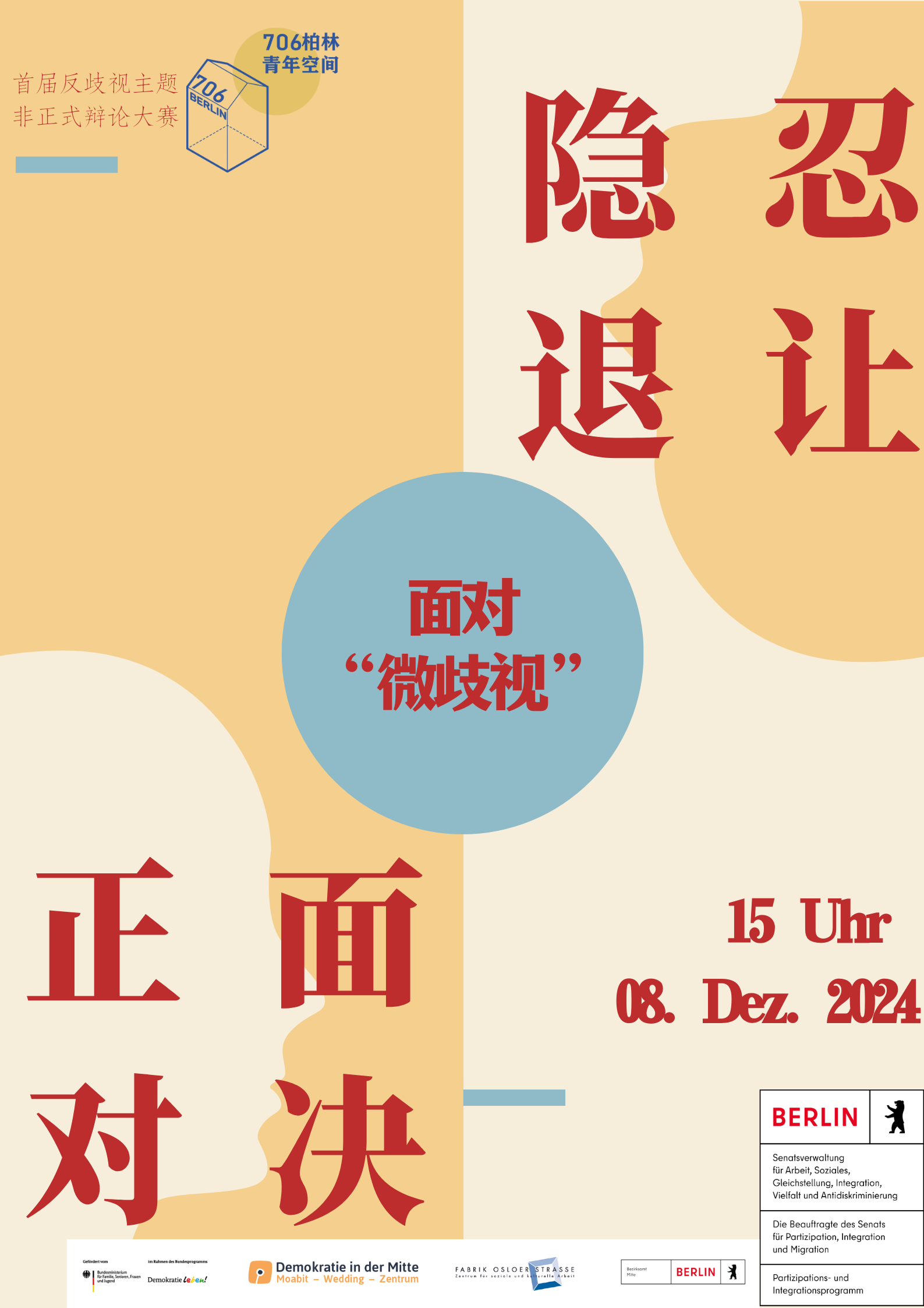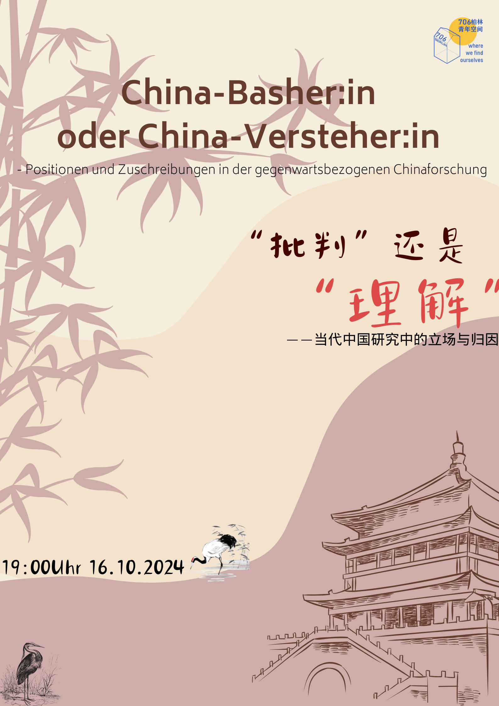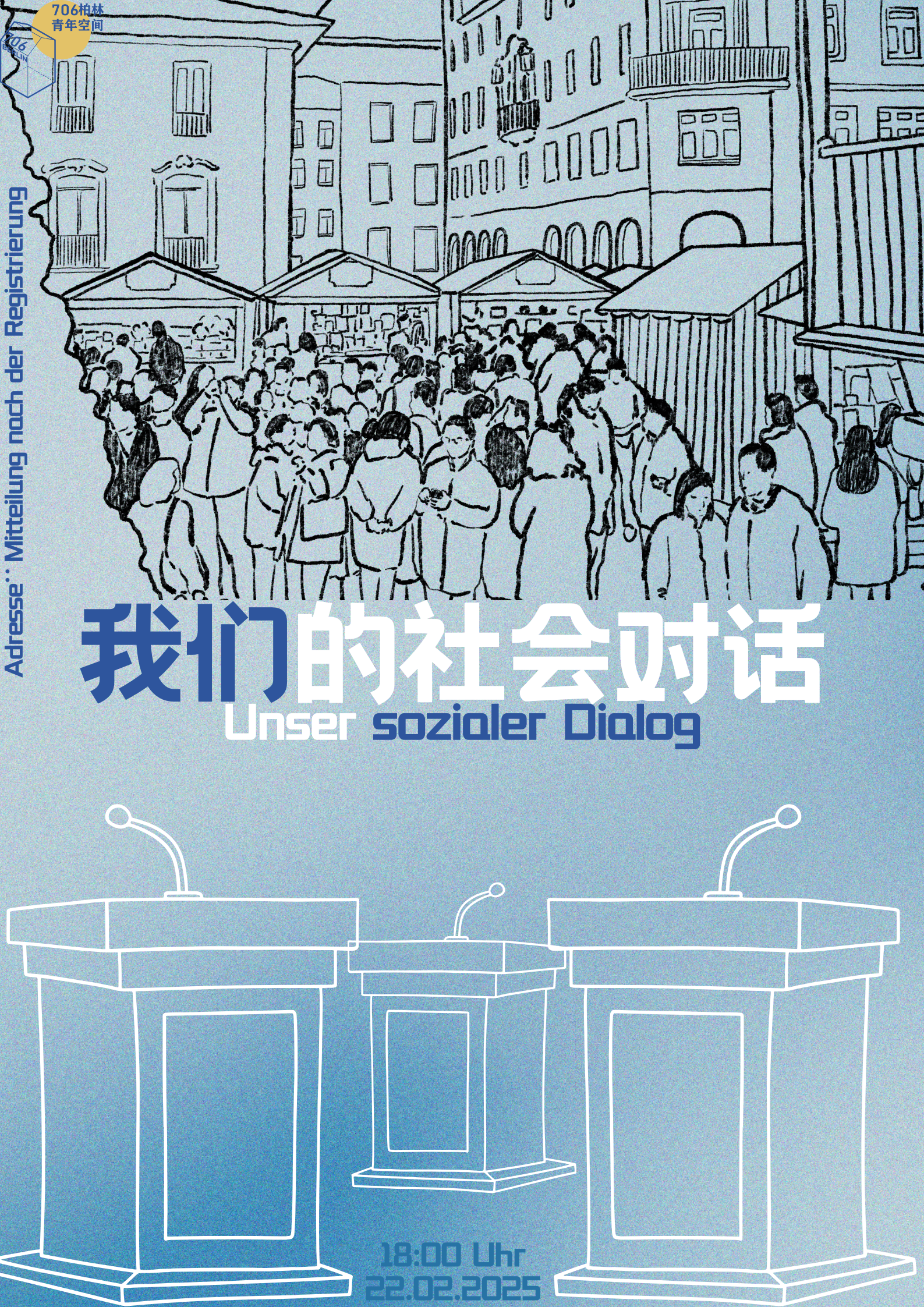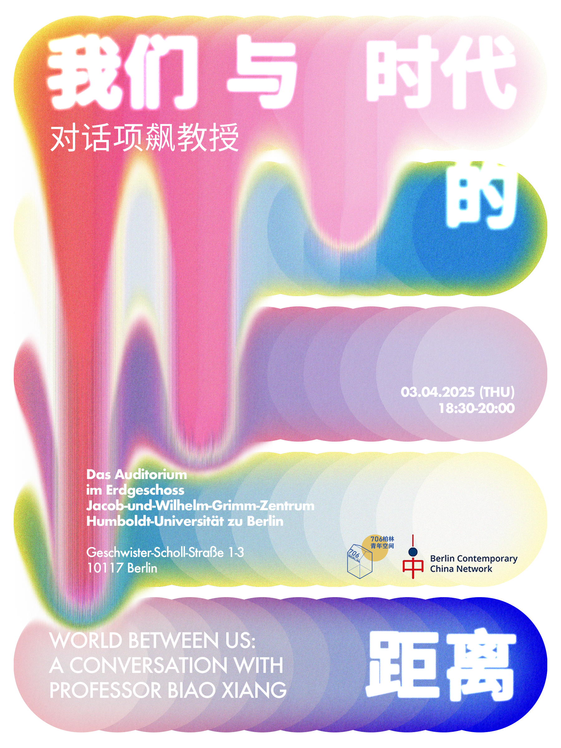 *——我们离开故土,怀揣梦想,渴望在德国扎根,却发现身份成了一道无形的屏障,职场的天花板变得难以撼动。* *——我们希望凭借所学与经验,架起连接中德的桥梁,却在瞬息万变的社会环境中屡感无力。* *——我们主动或被动地选择在德国展开新生活,却在每次回国时,面对日渐年长的家人那些期待与渴望无言以对。* *——我们深知社会原子化带来的冷漠,却也体会到,在异国他乡融入社会、找到志同道合的人,远比想象中艰难。* 过去三年多,706柏林里无数个“我们”的故事被聆听、被诉说、被记录、被思考... 那些初来乍到的忐忑,那些找到共鸣的喜悦,那些执着探讨未竟问题的深夜——在这里,它们交汇、回响,成为彼此时代的印记。 什么是好的时代?什么是坏的时代?或许,我们无法给出一个标准答案。但在一次次相遇、一次次对话、一次次共度的时光里,我们试图理解、试图连接、试图找到属于我们的答案。 706柏林协会很荣幸与Berlin Contemporary China Network (BCCN) 合作,并邀请马克斯·普朗克社会人类学研究所所长项飙教授,与我们一起探讨——我们与时代的距离。 本次活动将以互动对谈的形式展开。参与者需要在报名时提交希望与项飙教授讨论的问题或话题。由于时间有限,我们可能无法涵盖所有提问,但会整合相关或相似的问题,以确保讨论更加聚焦。 为了让交流更有针对性,我们鼓励大家优先提出与在德华人学习、生活或移民经历相关的话题,尽量避免过于宏观的问题(如“如何看待未来的中欧关系?”)。期待与你一起共同思考、对话。 —————————————————————————————————————————————————— ⏱️活动时间 2025年4月3日(周四) 18:30-20:00 🗺️活动地点(已更改) Auditorium, Jacob-und-Wilhelm-Grimm-Zentrum, Geschwister-Scholl-Str. 1-3, 10117 Berlin ⚖️活动费用 免费 🗨️人数限制 max. 40 ☺️活动语言 英语/中文 👐🏼(link: https://docs.google.com/forms/d/e/1FAIpQLSdNIc4bx-d2hqdN2NHIH7Lo_KtW1sTvoAcqtX_6a3Iyv9eG9g/viewform?usp=dialog text: 点击此处报名) **现场席位有限报名通道将在报满后自动关闭* (link: https://berlincontemporarychinanetwork.org/ text: 更多关于BCCN可点击此处。)