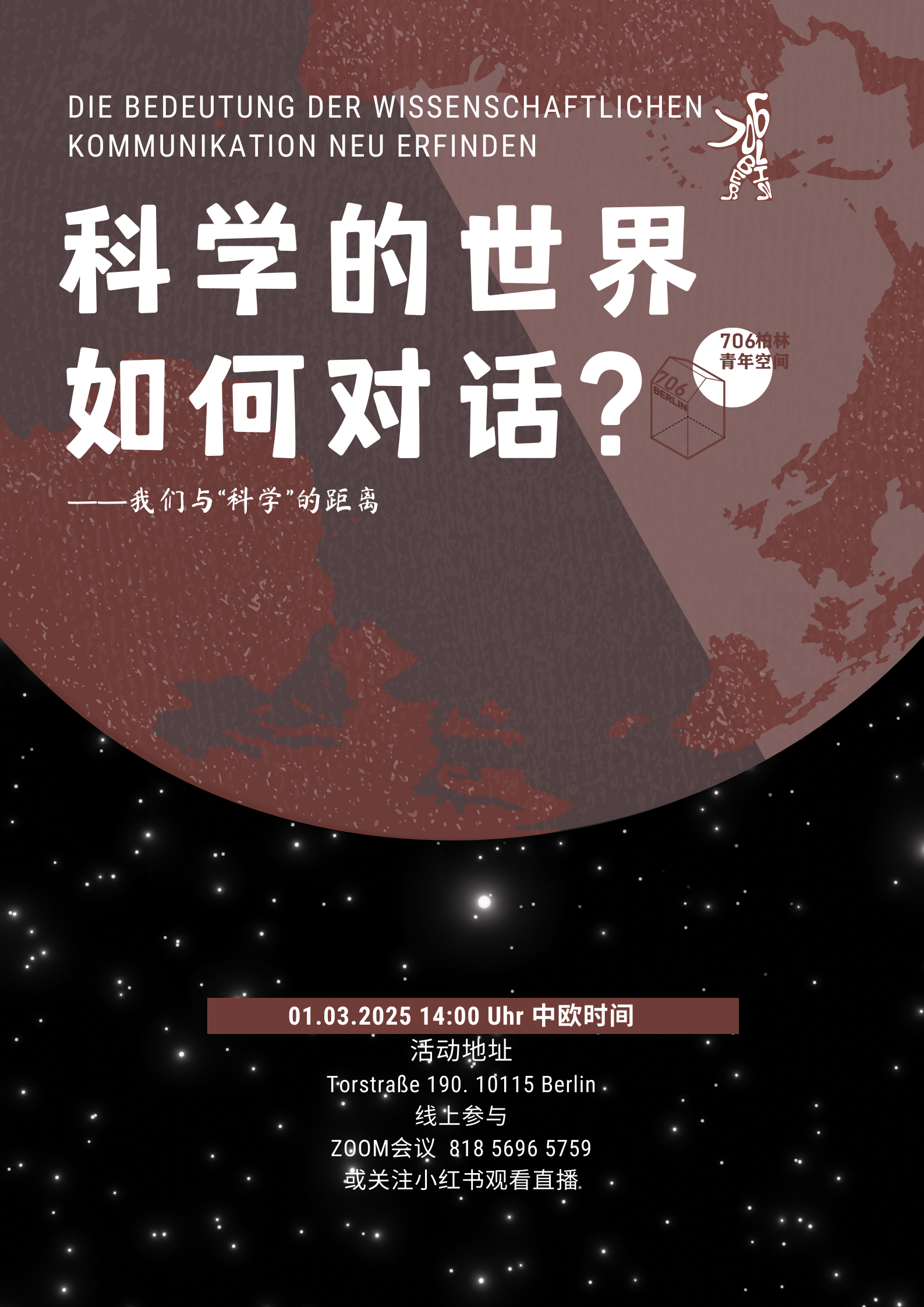 🔬 科学如何被误解?如何更好地沟通科学? 在社交媒体和日常对话中,常能听到这样的声音: “物理学已经停滞了50年。” “科学就是基本定律的探索,其他都是应用。” 这些观点有道理吗?如果没有,误解从何而来?科学家与公众之间的沟通为何如此重要? 这次活动,我们邀请到科普UP主 @两口子讲物理(习悟),与大家探讨 科学、误解与沟通。 📅 活动时间: 中欧时间:2025年3月1日(周六)14:00-17:00 北京时间:2025年3月1日(周六)21:00-24:00 📍 活动地点: 线下:Torstraße 190, 10115 Berlin 线上:ZOOM会议号:818 5696 5759 或关注 小红书直播 💰 活动费用:免费 📜 活动流程 🔹 14:00 – 14:30 自我介绍 🔹 14:30 – 15:30 发起人分享 🔹 15:30 – 15:40 茶歇 🔹 15:40 – 16:30 Q&A互动 🔹 16:30 – 17:00 自由讨论 👉 报名链接:[https://docs.google.com/forms/d/e/1FAIpQLSeQCulPvbJfbJ4gMOixYFWJl7_PCgsnjm6oH2QJ3ah35JRBBA/viewform] 🔬 发起人介绍 习悟,柏林理论物理博士生,研究方向为凝聚态物理与量子混沌。热衷跨学科交流,日常爱好包括读书、听播客、城市漫步、拼图游戏和骑行。 🎥 B站UP主:@两口子讲物理 🔍 主题导读:科学的误解与沟通 🔹 为什么“物理学停滞”是一种误解? 🔹 还原论 vs. 层展论:科学发展的不同路径 🔹 科学传播的挑战:面对“反智主义”,如何有效沟通? “科学最终会有用” 并不能替代有效的对话。面对拒绝相信气候变化或疫苗的人,如何打破信息泡沫?科学家是否应该更多地走入公众视野? 期待你的参与,与我们一起探索 科学、误解与沟通! 🚀