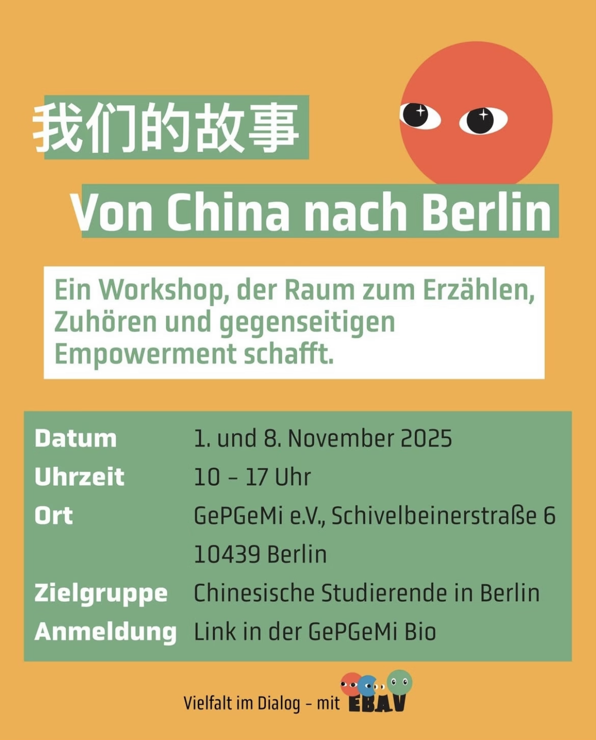 身为留学生的你是否有过这样的时刻: 别人的话语、态度让你感到有些不舒服, 但你又无法确定: 这是语言问题吗?还是文化差异? 还是……我被歧视了? 疫情期间,拥有“亚洲人”外貌的我们,是否感受到更多不友善甚至恶意? 许多在德国留学的中国学生都经历过这样纠结、困惑甚至痛苦的时刻。 这一次,我们邀请你加入一场特别的工作坊: 和同伴们一起聊聊那些“灰色地带”,拆解种族主义、直面亚裔歧视背后的真相,探索更有效的自我保护和应对方法 ## 💬 工作坊内容 在这个为期两天的工作坊中,我们将倾听彼此的故事,讨论反(亚裔)种族主义在德国语境中的表现,以及背后起作用的社会结构。 同时,我们将通过: **🎭 角色扮演 🧍‍♀️ 简易剧场练习 🤝 身体与表达训练** 来练习如何在有挑战的环境中更从容地设定边界、表达需求。 最后,我们还会一起思考: 如何利用身边的支持资源 如何在日常中彼此团结、互相支援 **📅 日期**:2025年11月1日(星期六) & 11月8日(星期六) **⏰ 时间:**10:00 - 17:00 **📍 地点:**Schivelbeiner Straße 6, 10439 Berlin, GePGeMi e.V. **👥 谁可以参加:**中国留学生 ## 👩‍🏫 主讲人 ### 娄顥程: “大家好,我是娄顥程。我在萨克森州的反种族主义项目 AntiRaktiv 工作已经三年了。 这段充满挑战的旅程里,我经历了许多难忘的相遇。 与来自不同生活背景的人同行,让我深受触动并获得力量。 这些经历让我更加坚信:人与人之间的联结,以及一个彼此善意支持、共同成长的社群,有着不可替代的意义。” ### 王玮琦: 目前在布伦瑞克美术学院任教, 并担任科研项目 “Kunst in Gesellschaft” 的学术研究员。 她长期参与公共艺术、参与式艺术以及公共空间艺术领域的创作, 曾在博物馆体系中担任艺术教育者及多元与公共拓展项目策展人。 在当下全球政治危机频发的时代,她愈发感到积极参与社会活动与讨论的必要。 💡 报名请点击(link: https://www.gemi-berlin.de/aktuelle-projekte-1/vielfalt-im-dialog-mit-ebav/empowerment-workshop-von-china-nach-berlin/ text: **链接**)。 如有疑问,欢迎评论或者后台私信。 欢迎你来,一起创造属于“我们的故事” ✨