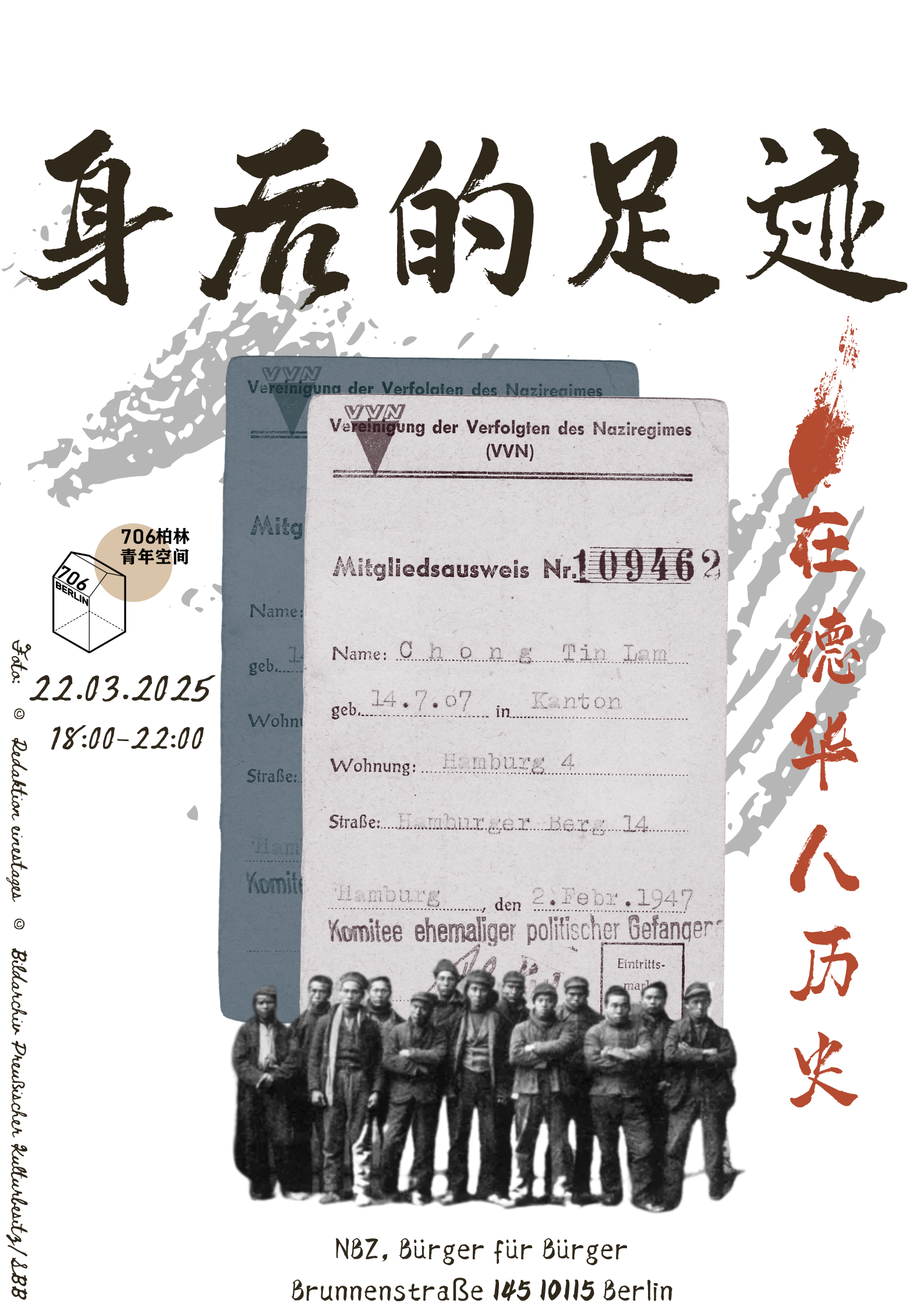**被遗忘的CHINATOWN** 中国人在德国的历史充满了冒险、坚韧和奋斗,也留下了深刻的伤痕。这段历史,即便对于在德的老一代华人们也依旧是陌生的。从19世纪末期开始,为了追求更好的生活和机遇,第一批中国劳工们和学生们便踏上了这片异国土地。在他们的脚步中,既有自由渴望和未来憧憬,也有举目无亲时的踌躇无奈和身处“黄祸”险境的艰辛苦楚。 **最早有记载的在德中国人** 冯亚星(Fung Asseng)和冯亚生(Fung Ahok)于1821年来到德国。他们最初在德国各地街头,协助烘焙师兼表演者Heinrich Lasthausen展览来谋生。后来在普鲁士皇帝的支持下进入了学术界,他们也影响了德国早期的汉学研究。他们后来在普鲁士皇帝的波茨坦皇宫茶室里工作,与德国本地女子结缘后生育了很多子女。他们的后代如今仍生活在德国及其它国家。他们的故事仍被在地的档案馆和博物馆记载。 **汉堡St. Pauli的唐人街 **   19世纪末,越来越多的中国人来到德国,既有外交官,留学生,也有船员和工人。一直到1920年代,汉堡的St. Pauli地区形成了繁华的唐人街。在这里,华人们经营的餐馆、酒店、棋牌室、歌舞厅比邻而立,街区充满活力。许多中国人与德国人成为伴侣,建立了跨文化家庭。然而,这一切在纳粹时期于1944年被彻底摧毁。 **唐人街的消失** 二战期间,纳粹政府不断迫害驱赶华人,并在1944年发起“Chinesenaktion”大规模逮捕行动。130多名中国人被送往劳改营,遭受严酷折磨,其中的部分德国伴侣也遭到拷打和强制节育。一年后,仅30人幸存。战后,这些华人失去了他们的商铺与财产,而唐人街从此消失。至今,德国政府仍未正式承认这段纳粹对华人迫害的历史,也未给予幸存者及其家属任何补偿。 本次活动不仅是一次历史回顾,更是一次现实的对话。我们邀请到了对在德华人这段历史很有感情的社会工作者赵越。让我们跟随她,转过身,看清来时的脚印,不是停留,而是更坚定地继续前行。 **关于发起人** *赵越* 社会教育者/社会工作者/三岁孩子的母亲/来德国12年/森林保护学硕士 即将毕业于柏林EHB(Evangelische Hochschule Berlin)。也是国际会议组织平台 AFORPOLIS(非洲森林政治与政策)联合创始人之一。 她原本投身于博士研究 (国际森林政治)和非盈利组织的工作,然而 2020 年 2 月,新冠疫情使德国交通中断,这突如其来的停顿,让她第一次真正有机会停下来思考:“我必须得继续做这个工作吗?” “我想在这个领域待 30 年吗?” 答案是否定的。她在一周内做出了决定:放弃博士、终止奖学金和博士合同,转而重新攻读社会教育本科。从那一刻起,她坚定地走上了一条忠于自己、倾听自己、看到自己、爱自己,并以内向外的方式与他人及世界建立联系的道路。 在 2020 年秋天,她开始系统性地学习德国社会的运作方式,从心理学、社会学、法律、医疗、政治到历史,这一切让她的热情变得更加具象:对社会发展的好奇、对人与人之间连接的热爱、对解放人的天性和赋予力量的追求,以及对基层民主的推动。但最重要的是,她更加明确了照顾中国同胞的心灵的责任感,在这个国家里,我们需要理解自己的处境,找到归属,也要学会如何保护自己。 德国大选前夕,她感受到了一种强烈的焦虑——社会对移民政策的讨论,竟与魏玛共和国及纳粹德国时期的舆论走向惊人地相似。在学校的一个反华人歧视项目中,她做了一项关于华人在德国的历史研究,这让她更加清晰地认识到:如果社会不加干预地发展下去,这种针对特定群体的排斥,最终可能演变为更极端的局面。但与此同时,她也深知:在一个民主国家,我们拥有发声的权利,了解历史,就已经掌握了真相,而真相能成为我们保护自己的力量。 这也正是她发起本次活动的初衷——希望这段被遗忘的历史被更多人知晓,希望参与者不仅收获知识,更收获一种力量和归属感。在动荡的时代,我们不要孤单,而是要在一起。 活动时间 2025年3月22日(周六) 18:00-20:00 活动地点 NBZ BrunnentreffBrunnenstraße 145 10115 Berlin 活动流程 18:00-18:30破冰环节 18:30-19:30早期华人故事和影像史 19:30-20:00互动游戏 20:00-21:00自由交流 活动费用 3€(706Berlin e.V. 成员免费报名参与) 活动人数 25人 (link: https://docs.google.com/forms/d/e/1FAIpQLSdVN-jBswfnZWRLETHQRo6Dcy2vi8_au78DCfhs0z3Ok0F_0g/viewform?usp=dialog text: 点击此处报名!)