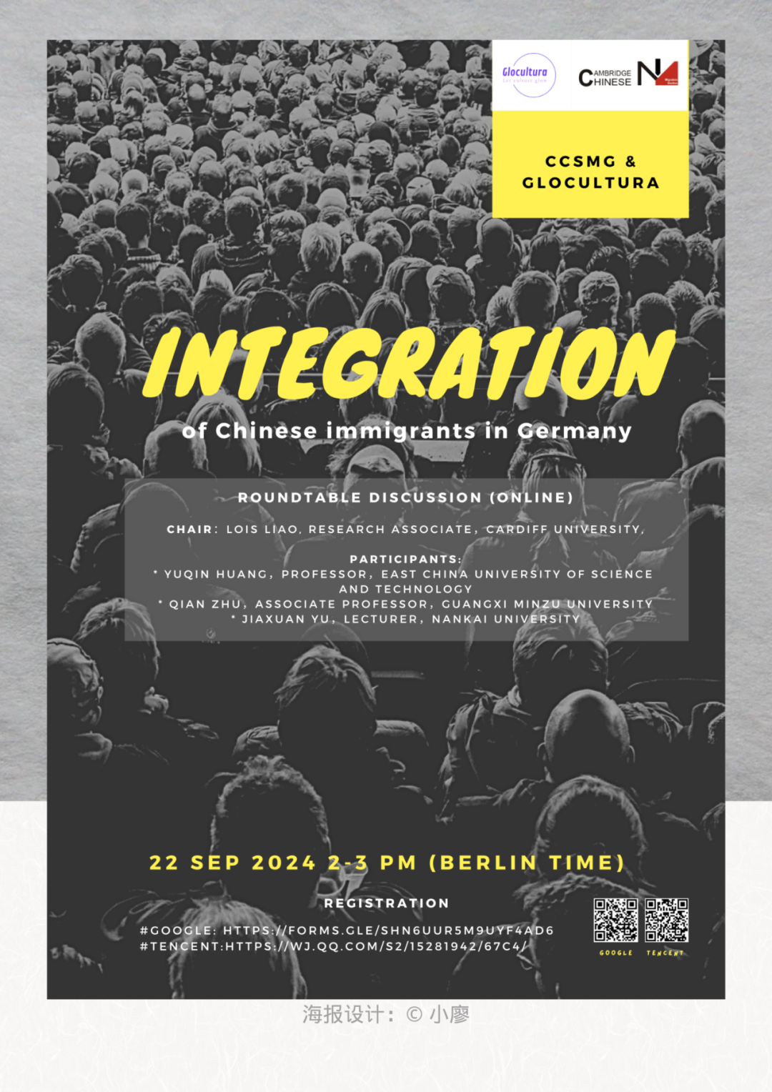在全球化的背景下,移民融入问题日益成为各国社会关注的焦点。而在706柏林,这也不算是个新话题。这次我们邀请了几位移民研究专家,和大家一起聊聊那些旧的和新的挑战 本场活动是探讨德国华人移民融入问题的圆桌讨论。我们将从不同德国华人群体的生活经历出发,探讨他们面临的挑战,以及如何理解和应对所谓的“融入问题”。 圆桌由廖翌晞(小廖)博士主持,特邀三位在德国移民研究领域的华人学者:于佳煖博士、朱倩博士和黄玉琴教授参与。 我们希望这次圆桌能在公共讨论与学术研究之间搭建起桥梁。活动前,请大家报名填写你最关心的问题,我们会共同探讨其中具有代表性的问题。 本次圆桌是706系列活动“在柏林的我和他们”的首场活动,由“剑桥大学中国移民研讨小组”协助。 本次活动在线上举行,报名成功后我们将给您发送线上会议室地址。 嘉宾介绍 于佳煖 南开大学社会学系讲师 美国埃默里大学社会学博士,复旦大学社会学硕士、社会学和汉语言文学学士,柏林自由大学访问博士 主要研究方向为文化、艺术、组织、全球化等,当前主要研究议题包括全球化与中国艺术音乐界的互构、海外华人音乐家的跨文化传播实践等 《分歧的意义理解:作为一种文化符号的广场舞》, 2020,《长三角社会学优秀硕士论文选编(2020)》,399-434,北京:中国社会出版社 《当本土遭遇全球:中国传统音乐世界的审美冲突》,2022,《中国社会学杂志》 黄玉琴 华东理工大学社会与公共管理学院社会学系主任、教授,博士生导师 北京大学法学(社会学)学士和硕士,英国埃塞克斯大学(University of Essex)社会学博士,曾任德国马克斯普朗克宗教与族群多样性研究所研究员(2009-2013) 主要的研究兴趣包括性别与发展、迁移与流动、中印社会比较研究等。 《性别视角下的村庄社会生活变迁:华中莲荷村的劳动、闲暇、女性及家庭,1926-2013》,2019年1月,上海:华东理工大学出版社 《“青春无悔的老三届”:集体认同的建构和坍塌》,2018年2月,(德)金琅学术出版社(Golden Light Academic Publishing) 《当代中国和印度社会比较研究》,2018年7月,成都:四川大学出版社 朱倩 广西民族大学副教授 德国科隆大学非洲文化与环境硕士,民族学博士,中山大学博士后 研究领域包括生态人类学,德国的中国新移民研究 《寻梦欧洲:难民伟子的德国打工路》,2019 《超越“经济理性”:劳动力流动背景下的丧葬仪式与村落秩序重塑》 廖翌睎(主持人) 在英国卡迪夫大学做社会学和社工研究。伦敦政经LSE博士后,伦敦大学学院UCL博士,剑桥大学本科。曾在中国人民大学和巴西圣保罗大学访学。 小组介绍: Cambridge Chinese Migration Studies Group (CCMSG) 剑桥中国移民研讨小组为依托剑桥大学全球人口流动研究中心、剑桥移民学社、牛津 大学移民、政策及社会研究中心建设的跨学科、多机构中英文研讨小组,旨在为相关 学界仝仁提供平等开放的平台及紧密支持的研究型社群。2019 年 11月成立以来,已举办线上线下研讨多次,参加学人遍布全球多间机构。在移民研究、人口流动、区 域发展研究、城市研究等多主题集思广益,促进各地学人交流合作。在海内外流动人 口研究相关社科界域拥有广泛影响力 。 Glocultura 通过举办活动,在移民/全球多数群体社区与移民所在国家主流文化之间架起桥梁。活动包含城市漫步、讨论、讲座、电影放映和DJ活动,所有活动都以少数民族文化及其移民历史为中心。长期合作伙伴包括纪录片放映平台CathayPlay,是伦敦London Engagement Collaborative成员组织之一。 活动时间: 9月22日 14:00-15:00 中欧时间 活动形式: Zoom链接