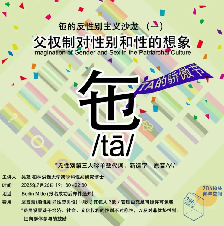 📅 **活动时间** 2025年7月26日(周六) 19:30 – 22:30 📍 **活动地点** Berlin Mitte (报名成功后通知具体地址) **活动背景** 最近,大连工业大学发布的一则公告在中文互联网上引发了激烈讨论:校方拟开除一名学生,理由是其“与外国人不当交往,有损国格、校誉”,违反校规。 这一措辞立刻引发了公众对性道德审判、性别歧视、教育体系对女性身体的规训,以及在“涉外性行为”中所体现的种族主义和民族主义话语的高度警觉。这不是孤立事件,而是国家父权制文化通过控制女性身体维系权力秩序的一个缩影。 我们的问题是: 谁来定义“正当”? 谁被赋予审判他人性道德的权力?谁又成为被审判的对象? 语言是如何参与性道德建构的? 当女性因“有损国格”被剥夺受教育权,而男性的性暴力却被忽视甚至被掩盖,我们必须追问: 在这套话语体系中,性别扮演了什么样的角色? **我们的邀请** 在柏林彩虹旗飘扬的七月,我们不仅走上街头宣示骄傲,也要深入语言与文化的结构,反思日常交流、制度逻辑与社会文化中潜藏的性别权力。 在CSD当天,我们发起一场结合行动主义与行为艺术的公共介入,欢迎你加入。 我们将以解构主义性别视角为起点,质疑“生理性别”这一貌似自然的生物分类,揭示其实质上深受社会建构影响。我们将引入性别研究的前沿概念——性别主义(Genderismus),以全面审视性别权力结构及其内在的多重歧视形式: 性别二元化 性别固化 男性中心化 异性恋中心化 女性母职化 性别标签化 我们将打破关于“性”的讨论禁忌,从汉语詈骂语出发,直面父权文化中女性被物化、遭受象征性性暴力的现象,同时探讨父权制如何以“男子气概”之名禁锢男性。 语言实践作为抵抗 我们将介绍若干语言实践,如: 可替代拼音“TA”的无性别第三人称代词“㐌” 新造词“愱炉”“英宏”“化粧”等 关于公共厕所无性别改造的建议 我们邀请所有汉语使用者共同参与这场反性别歧视的语言实践。 **我们的态度** 我们期待㐌们的到来,在相互倾听、共享多元经验的过程中,表达我们的主体性。 正如一位脱口秀演员曾说: “你听,那些笑声,那是血肉疯长的声音。” **活动流程** 发起人引导与开场 嘉宾对谈 现场 Q&A 自由讨论 **活动费用** 盟友票(顺性别异性恋男性):10 € 其㐌人(包括跨性别、非二元、女性及性少数群体):3 € **报名方式** https://docs.google.com/forms/d/e/1FAIpQLSe6D6zOFBVY0Ew8dsE5Ml5uGwxZgvpmYUMUBKtE8jHpKdSvfw/viewform **活动发起人** 吴勊 性别代词:㐌(汉语)/ they(英语)/ *(德语) 出生于北京。柏林洪堡大学跨学科性别研究博士,博士论文《Genderismus in chinesischen Sprachhandlungen(汉语中的性别主义)》获最高学术荣誉 summa cum laude。曾就读于马尔堡大学,获欧洲人类学与文化研究硕士及社会学学士学位。
