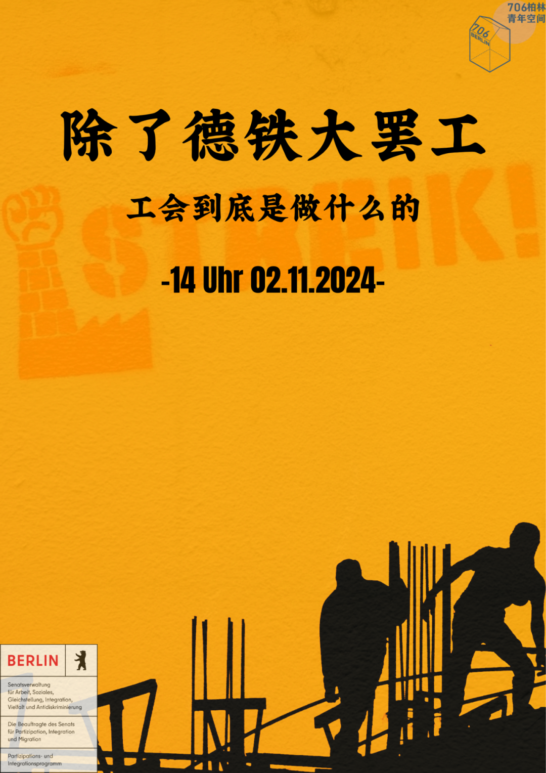你刚来德国,拿着最低工资在餐馆打零工到深夜,羡慕德国火车司机动不动就搞罢工?你好不容易读完了学位,开始工作,结果发现物价涨的飞起,工资却好几年没怎么变?或者,你怀揣梦想来到德国,却因为自己是个外国人,遭到同事、上司歧视和排挤,能力再强也得不到认可? 成年后来到德国的初代移民们经历的困难和挣扎,很多都和工作密切相关。签证和语言限制了我们,比起德国本地人,我们常常只能选择工资更低、缺乏保障的工作。来自上司或同事的显性或隐形歧视,是职场中看不见的天花板,也是许多人一生都难以逃离的创伤。 然而,这些不公平是可以被改变的,我们被侵犯的权益也是可以要回来的。在工作中遇到问题时,工会可以帮助我们做出改变。 **这一次,就让我们一起来聊一聊,德国的工会是什么,能做什么,以及如何能帮到我们。** **德国一共有8大行业工会,近600万名会员,近半数打工人的薪酬由集体协议规定。每年几个大型劳资谈判,可以说反映了德国全国的工资整体走向。**作为还没有选票的初代移民,参加工会是一种能够实实在在改善我们在德生活的方法。 发起人buji说: 作为一名在校留学生,我最早通过学校的学生助教们(TV-Stud)认识了工会。 后来,我有机会亲身参与工会的组织工作,比如打电话动员工人,在职业学校给培训生讲解工会基础知识,以及参与移民外卖骑手的组织行动。 这些行动内容不同,形式各异。有的是无偿志愿活动,相对比较松散、自由,也有的是有偿正式工作,要遵守严格的规范。 无论如何,它们都成功地让我感受到,团结,尤其是劳动者之间的理解与团结,不仅可以赢下更高的工资,还可以跨越文化、性别、年龄,塑造我之前以为完全不可能的连结。 当然,这次活动不止于分享。我也想听听大家的想法:有没有在工作场所中遇到的困难,有没有对工作环境或者薪资感到不满等。如果有的话,我们可以看看工会有没有相应资源,能不能帮到你,也希望我们人多力量大,给你的问题想出解决办法。 活动结束之后,如果你有维权或其它需求,我们也可以讨论如何相互帮助支持。我会尽量用我现有的知识,给你提供帮助。 活动安排: 活动时间 2024年11月2日(周六) 活动地点 Torstraße 190. 10115 Berlin 活动流程 14:00-14:35 自我介绍 14:35-15:10发起人分享(工会基础知识和参与工会的经历) 15:10-16:00 问答&茶歇 16:00-17:00自由讨论 活动费用3€(协会成员直接参与) 报名链接 https://docs.google.com/forms/d/e/1FAIpQLScRiX70aiRmXjkSF4K24f0NbNszxVme1Uv_qHeHL8ZOu_z1-w/viewform **发起人 buji** 柏林在校学生 在德国参加过一些工会活动。学习工作之余,主要爱好是骑自行车、怀念中国美食、和伴侣在家发呆。 内容:@buji排版:@Ray图片:©private活动策划:@Da @边缘创作:© 706Berlin e. V.