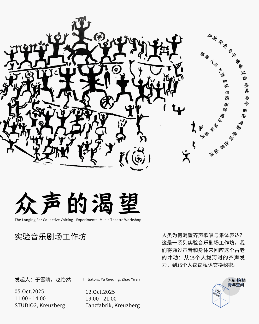 # 🌟 工作坊活动预告 🌟 ## 【活动内容】 有一天我突然在想,人类为何渴望合唱?这就是本次工作坊的起点。比起千千万万的合唱歌曲与方法,我更感兴趣的,是那种原始的、内在的冲动。 从拔河、搬运、拉纤时为统一发力而喊出的号子,到竞技中呐喊“加油”的鼓舞;从火鸡、羊群等动物的群体鸣叫,到人类祖先在狩猎防御中发出的吼声;从古代流传的谶谣、童谣,到《诗经·风》中口耳相传的民间歌诗,乃至“千人所指,无病而死”的集体诅咒。 这两次工作坊将作为探索的起点。我们将以身体与人声为主要媒介,逐步深入集体发声在实用、社会、审美与精神等不同层面的表达,并尝试从中发展出音乐与戏剧的形态,鼓励荒诞与失败的尝试。 同时,即兴是工作坊的重要部分,而集体与个人的关系,也是其中持续回响的主题: * 我们如何在无人“指挥”的情况下实现同步? * 又如何共同推动一场未知的展开? --- ## 【活动安排】 **第一场** 📅 时间:2025年10月5日 (周日) 11:00 - 14:00 📍 地点:Studio2 Kreuzberg (Mariannenpl. 2, 10997 Berlin) 🤍 内容:人类究竟为何渴望齐声歌唱与集体表达? 🎶👥 先放下严肃的讨论 🙃,让我们在集体游戏 🕹️ 与即兴互动 🤹 中,先亲身感受“齐声”各种各样的可能 ✨。 在这个安全的环境里,你很可能会体验到: 1️⃣ 和其他 10 个人一起说话 🗣️ 2️⃣ 和其他 10 个人一起大声说话 📣 3️⃣ 和其他 10 个人一起坐仰卧起坐 🤸 4️⃣ 和其他 10 个人一起手牵手做仰卧起坐 🤝🤸 在集体力量的漩涡中 🌪️,你可能会惊叹于自己内在的强大 💪,也可能发现一份超乎寻常的冷静 🧘(应该不太会)—— 一切皆有可能,答案正等待你与即将相遇的这群人共同揭晓 🌌。 **第二场** 📅 时间:2025年10月12日 (周日) 19:00 - 21:00 📍 地点:Tanzfabrik Studio 3, Kreuzberg (Möckernstraße 68, 10965 Berlin) ### 活动流程(以10月5日为例): * **11:00 - 11:30** 热身游戏 * **11:30 - 12:30** 工作坊环节 * **12:30 - 12:50** 休息 * **12:50 - 13:40** 工作坊环节 * **13:40 - 14:00** 交流与反馈 --- ## 【关于未来】 我希望能持续组织每月1-2次、以身体参与为主、过程导向的探索工作坊,围绕人声、身体、物件和文字四种媒介展开。 我期待参与者在过程中获得灵感,启发个人的研究与创作,再带着新的思考回归,共同发展下一次的探索。 像传播八卦一样组织工作坊 ⸺ 这是我最近的感悟。八卦是社会的粘合剂,说八卦的人眉飞色舞,听八卦的人竖起耳朵、睁大眼睛,那一刻,我们的感官全然在场,最重要的是:要开心! --- ## 【参与信息】 💰 **费用**:工作人士 10€ / 学生 6€ (单场费用,用于防鸽及场地和相关成本) 👥 **人数**:最多约 15 人 📝 **报名方式**:通过以下链接报名及缴费,成功后会收到确认邮件。 👉 链接:(link: https://docs.google.com/forms/d/e/1FAIpQLSdAUoW-VgauZUIdUng9YofQ0ZfQ5IFnt911DlILa3XgoWHVjA/viewform text: 报名链接) 可以单场报名,也欢迎两场一起参加。若这两次错过,欢迎联系发起人获取后续活动信息: * Instagram: **@xue.x.u.e** * Email: **[yu.xueqing0201@gmail.com](mailto:yu.xueqing0201@gmail.com)** ⚠️ 注意事项: * 活动场地为舞蹈室,需脱鞋入场 * 请穿舒适、适合运动的衣服和袜子 * 建议自备饮用水 --- ## 【发起人】 **于雪晴** 一个在人群中不爱说话,却极易在集体游戏中被点燃的人。 合唱指挥、表演创作者。柏林学友合唱团与 Musicam Amantes 合唱团指挥,毕业于柏林艺术大学 Eurhythmic/Music and Movement。长期参与剧场与电影的集体创作,并为短片担任声音设计。 **赵怡然** 一个喜欢以第三视角观察世界,在合适环境中乐于解放天性的人。 独立作曲人、实验音乐剧场创作者。芬兰 OBLIVIA 实验音乐剧场团队音乐总监,曾任教于布鲁克纳音乐与舞蹈大学。现于汉堡音乐与戏剧大学从事艺术研究,方向为肢体动作在现代音乐创作中的应用。