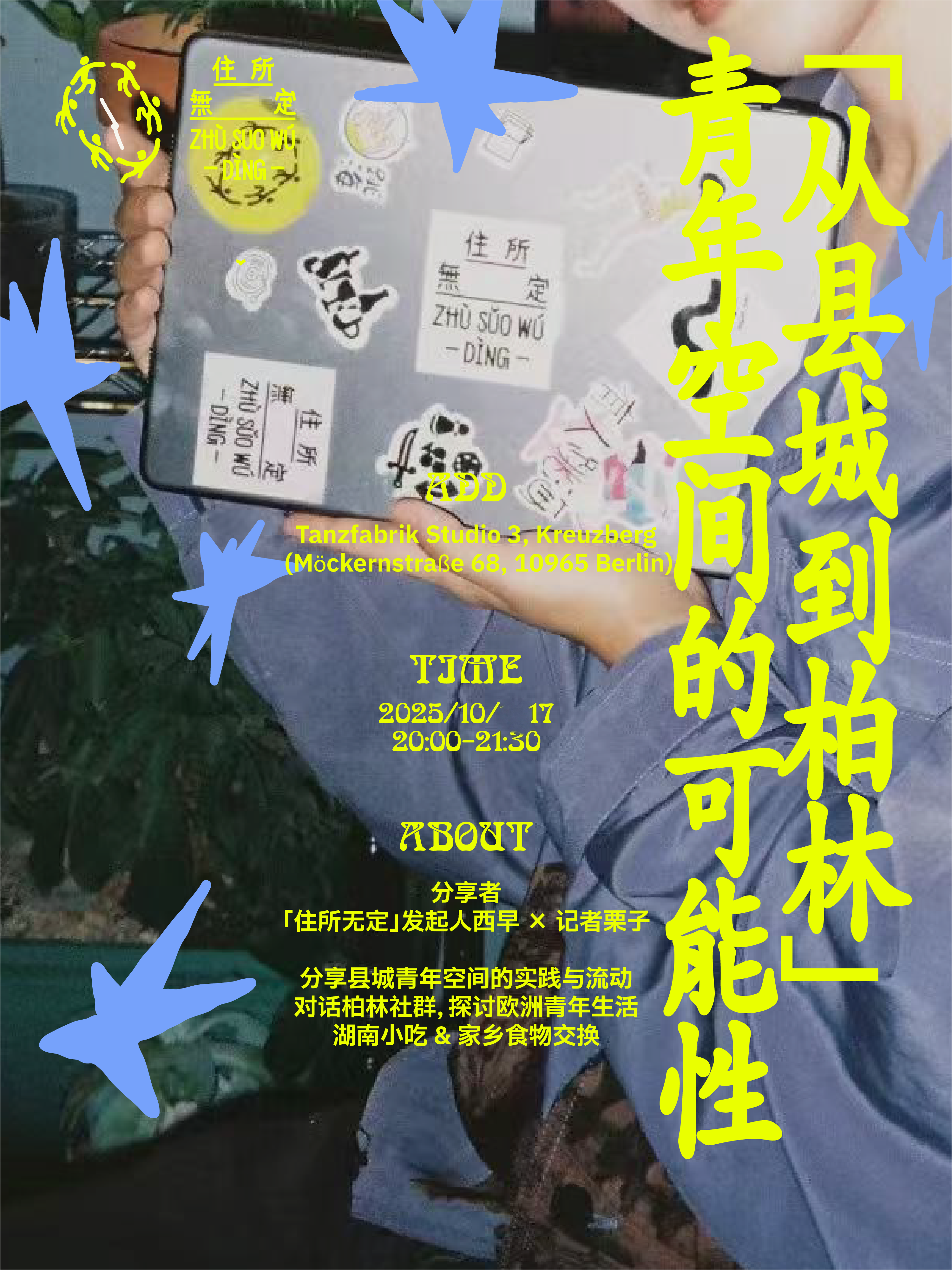 **【活动内容】** 「住所无定」是一家来自湖南省慈利县的青年空间,以日咖夜酒的方式聚集朋友。2025年大年初一,我们落脚在湖南西北部县城,希望构建一个在结构之外、缝隙之内的县城青年空间。 我们想在城市体系的边缘——县城,做一个让自己不觉得无聊的地方:下班后可以一个人来喝一杯、打打游戏,也可以翻翻那些在日常书店里找不到的书。这里欢迎女性朋友安静小聚,也欢迎大家认识新朋友;有人在这里尝试副业,低成本摆摊;有人发起活动,把县城里的年轻人聚在一起。在消费之外,我们更希望成为一个连接的平台,保持流动、灵巧、开放的氛围。 从开业至今,「住所无定」很少“安分”。我们习惯流动,在不同的地方观察、玩耍,顺便创造。 2025年春天,我们陆续抵达东京高円寺Nantoka Bar当一日店长,在宁波开春集摆地摊、去漳州门口muinn-khau和本地创业伙伴聊县城创业经验,也在上海新华社区占领过吧台,还参与外滩美术馆建筑节,做了一场关于县城公共空间的zine工作坊。一路上,我们和许多新老朋友碰面、协作。 这次10月,我会来柏林停留5天,转转各类空间,也顺便看看在柏林驻地的栗子。栗子是湖南长沙人,曾两次到访慈利县,参与「住所无定」的开业和上海活动,这次在柏林的驻地主题也与“占屋”相关。 「住所无定」与柏林706也有一段前缘。2024年底,在紧张筹备县城空间的过程中,我听过一场柏林706的经验分享,看到在欧洲构建华人流动社群的尝试,也对不同区域青年空间的共性与差异有了更多思考。因此,这次更期待与柏林的朋友们面对面交流,了解和探讨你们的经验。 **【活动安排】** - 分享「住所无定」的故事 - 交流和讨论:在欧洲大家已有或需要的青年空间 - 西早和栗子会准备一些湖南小吃(食材视中超情况),欢迎大家带与家乡相关的食物或小零食,一起分享 **活动费用** 5€*学生3€**「706柏林」协会成员免费 (link: https://docs.google.com/forms/d/e/1FAIpQLSeNpi4AwqirsPztA_47plgY2egM2MAixOm88A64lbD5CSLXRg/viewform text: **报名链接**) **【发起人】** **西早**:「住所无定」空间的发起人之一。现居伦敦,就读于城市规划博士,研究方向是上海青年的消费空间,关注商业空间在经济之外的可能性。曾在商场做过营销企划,喜欢跑动、观察空间、和吃辣的东西。 **栗子**:记者,现工作生活于上海,主要报道性别与政治议题,最关注权力的灰色地带与一切“非正规”,喜欢薅羊毛,钻空子,研究逃避统治的艺术。另外也做一些和科技平权有关的事情,有一个组织叫“织码女巫”(小红书)。这次来柏林一个月研究占屋社群。